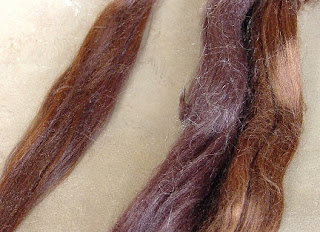 Here is a photo of prepping the viscose to be applied to the dolls.  I will start with Jocelyn and then wig Stephanie.  Each girl has a medium brown color hair in 2 ponytails (pigtails without the braids).  I chose to blend the hair colors as their color was in between 2 colors and also I feel it adds realism to the finished doll, especially with portrait dolls.  I will be posting step by step photos of the hairstyle as it progresses.